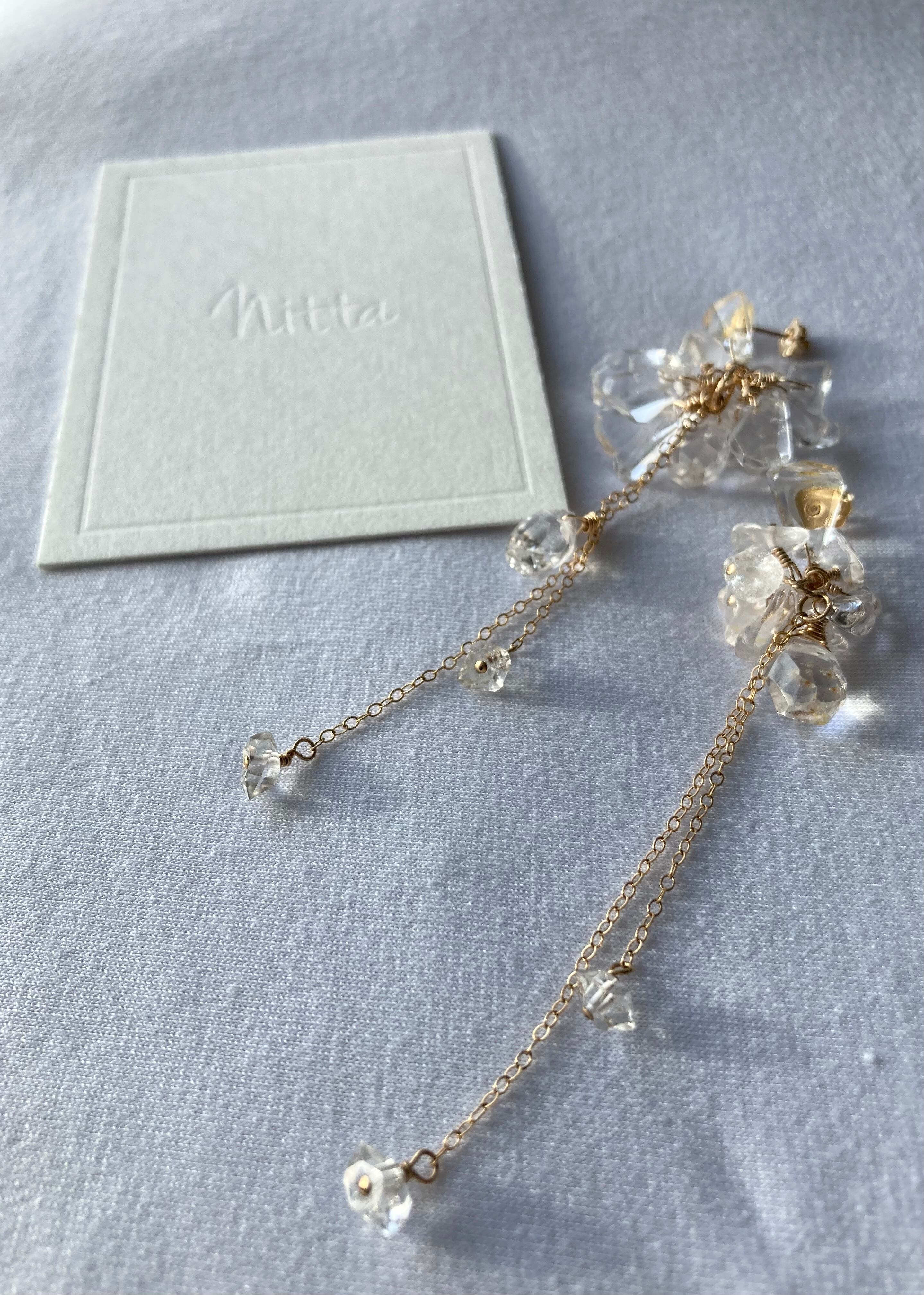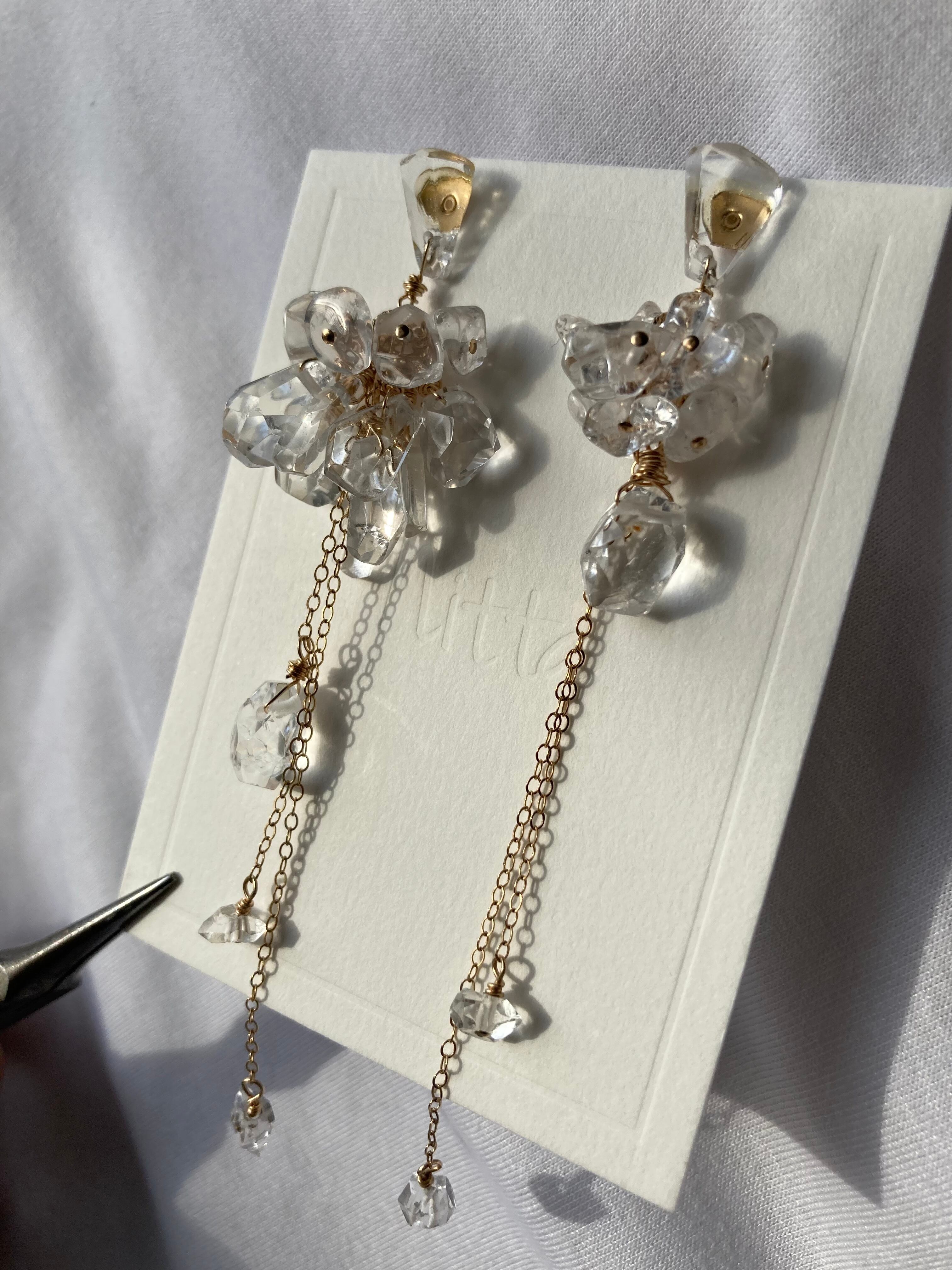 さまざまなクリスタルを重ねてアシンメトリーのシャンデリアピアスにしました。